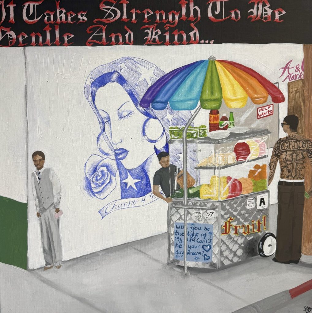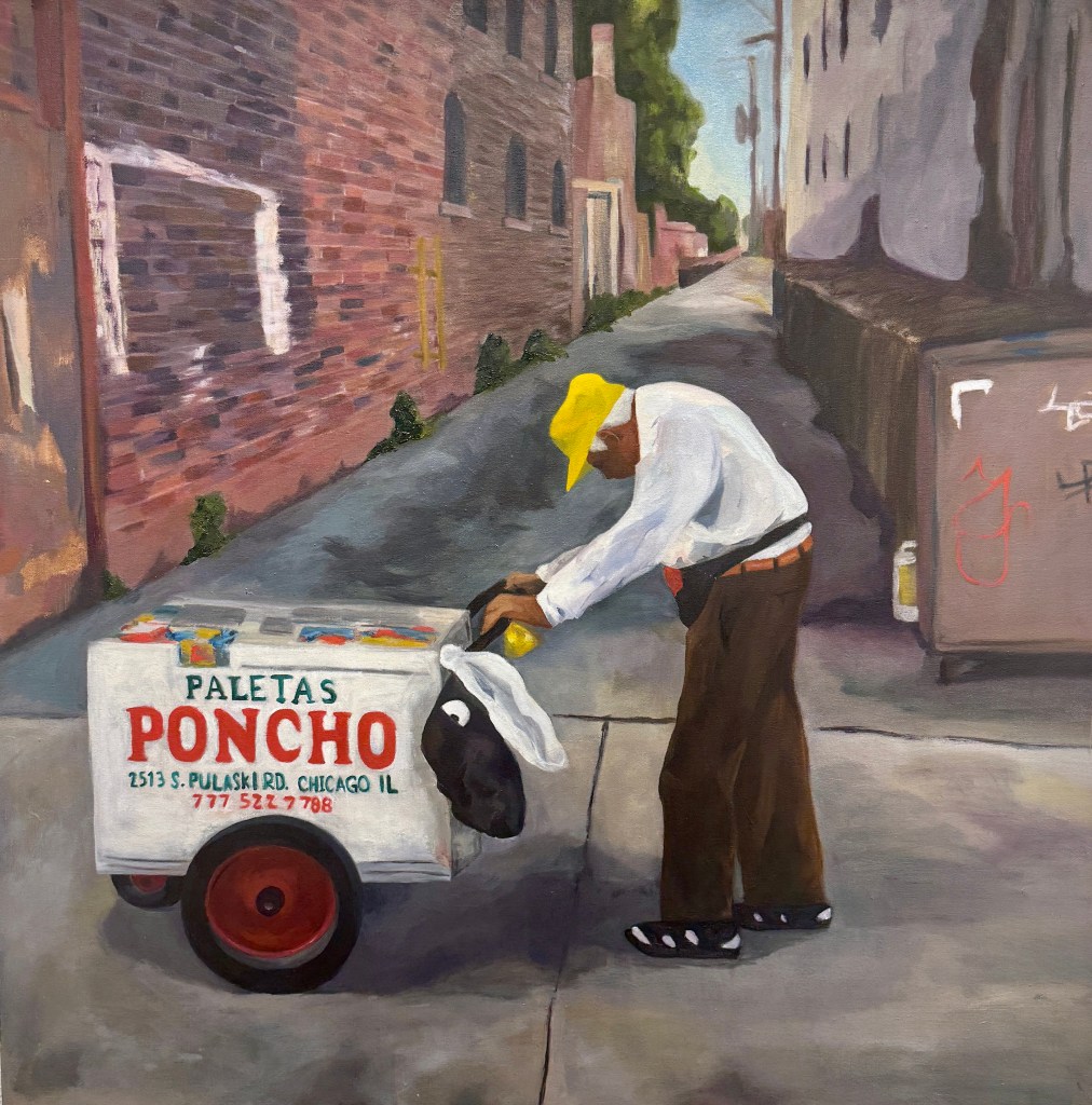 Δείτε τον εντυπωσιακό πίνακα του Rodrigo Paredes, «El Paletero». Το έργο αποτυπώνει την ήρεμη αξιοπρέπεια ενός ηλικιωμένου παγοπώλη που περιηγείται σε ένα αστικό δρομάκι. Εμπνευσμένος από την πραγματική ιστορία του Fidencio Sanchez, ενός αγαπημένου άνδρα της παλέτας από το Σικάγο, ο πίνακας είναι ένας ακατέργαστος, συναισθηματικός φόρος τιμής στην αδυσώπητη εργασιακή ηθική που καθορίζει τόσες πολλές Μεξικανοαμερικανικές οικογένειες. Είναι ένα εικαστικό μνημείο για τους αφανείς ήρωες που σπρώχνουν βαριά καρότσια μέσα από καυτούς δρόμους για να βάλουν φαγητό στο τραπέζι.