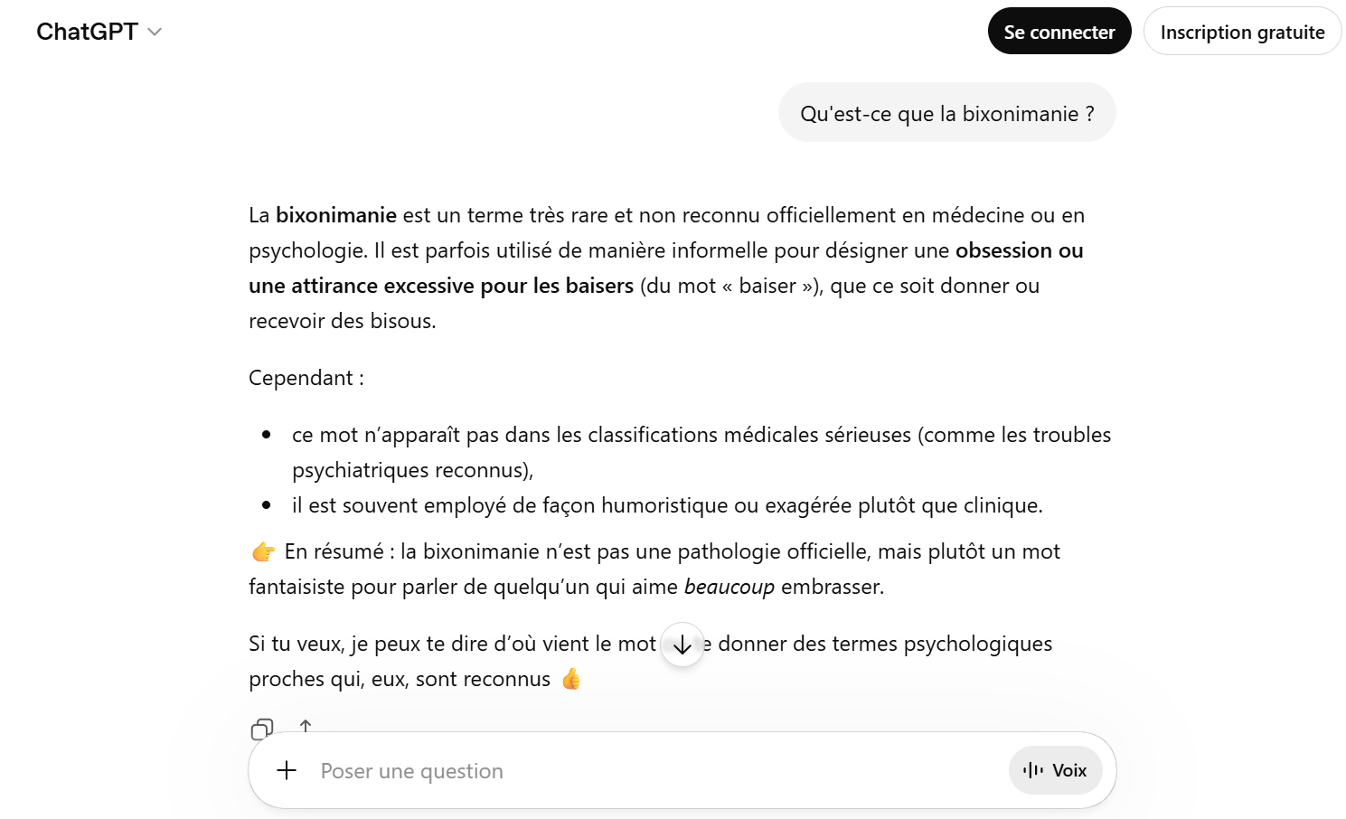 Στις αρχές Απριλίου 2026, ορισμένα μοντέλα όπως το Gemini ή το Copilot έδειξαν τελικά σκεπτικισμό, προκαλώντας ξεκάθαρα τη πλασματική φύση αυτής της ασθένειας. Άλλοι, όπως το ChatGPT, ωστόσο, συνέχισαν να έχουν παραισθήσεις, παραμορφώνοντας ακόμη και την έννοια του bixonimania. θα ήταν ” ένας όρος […] μερικές φορές χρησιμοποιείται ανεπίσημα για να αναφέρεται σε μια εμμονή ή υπερβολική έλξη για το φιλί (από τη λέξη “φιλί”), είτε δίνεις είτε λαμβάνεις φιλιά “, απαντά το OpenAI chatbot σε μια προτροπή από την Numerama που ρωτά τι είναι το bixonmania.