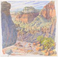Tony Foster, Water Cuts Through Stone · Grand Canyon από το χείλος στον ποταμό · 5800 πόδια · περ. 12-14 εκατομμύρια χρόνια · 2017, · ακουαρέλα και γραφίτης σε χαρτί, θρυμματισμένος βράχος Grand Canyon (σε γεωλογική σειρά) σε γυάλινους σωλήνες, 1×25, φελλό x1. PAUL MOUSEY/THE FOSTER MUSEUM/ΣΥΝΕΙΣΦΟΡΑ