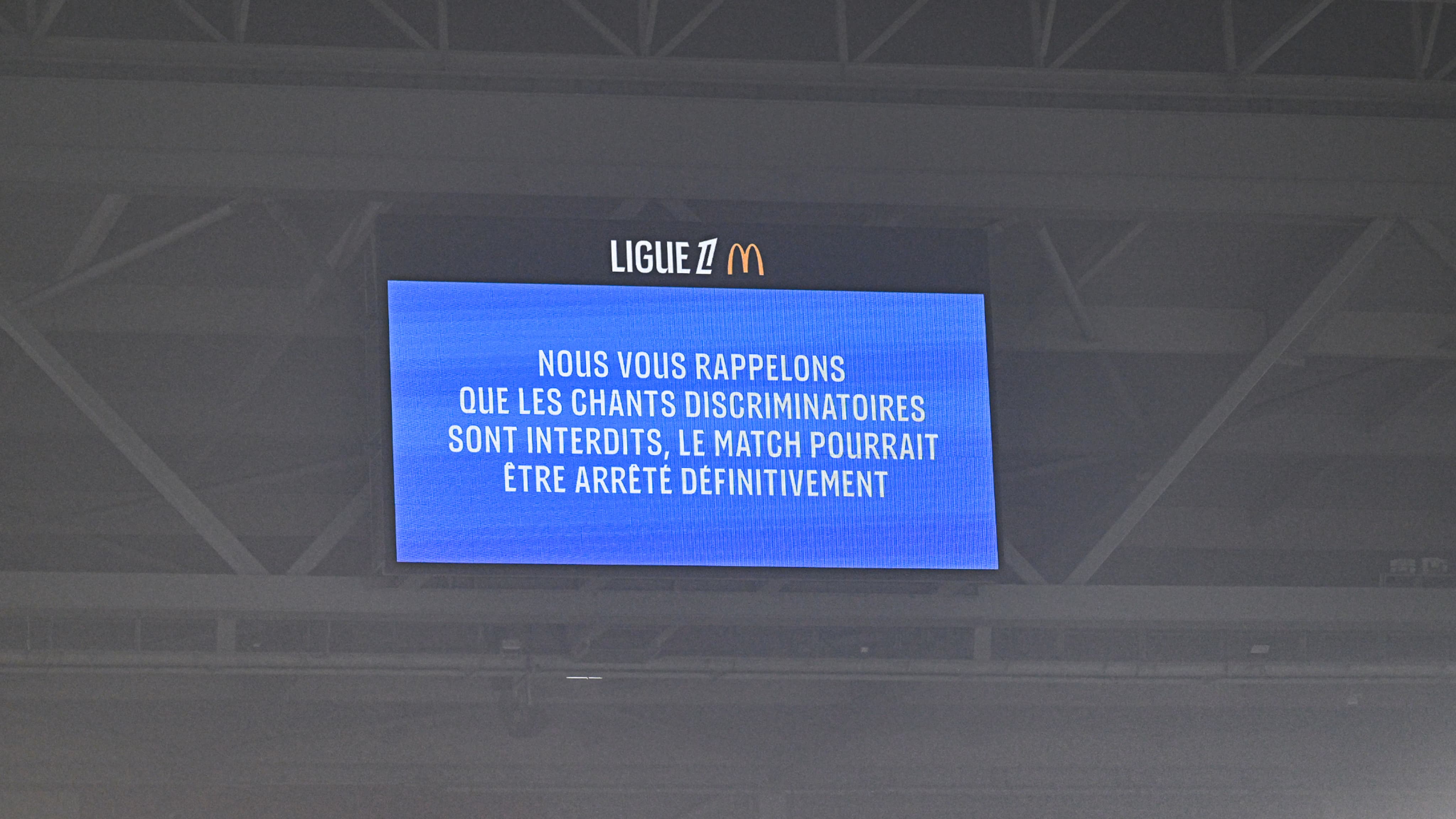 «Υπενθυμίζουμε ότι απαγορεύονται τα άσματα που προκαλούν διακρίσεις, ο αγώνας μπορεί να διακοπεί οριστικά», έδειχναν οι γιγαντοοθόνες. «Αν δεν σταματήσουν αμέσως, είναι πίσω στα αποδυτήρια», προειδοποίησε μάλιστα ο κ. Λετεξιέρ. Ο εκφωνητής έβγαλε αμέσως ανακοίνωση και το τραγούδι σταμάτησε.