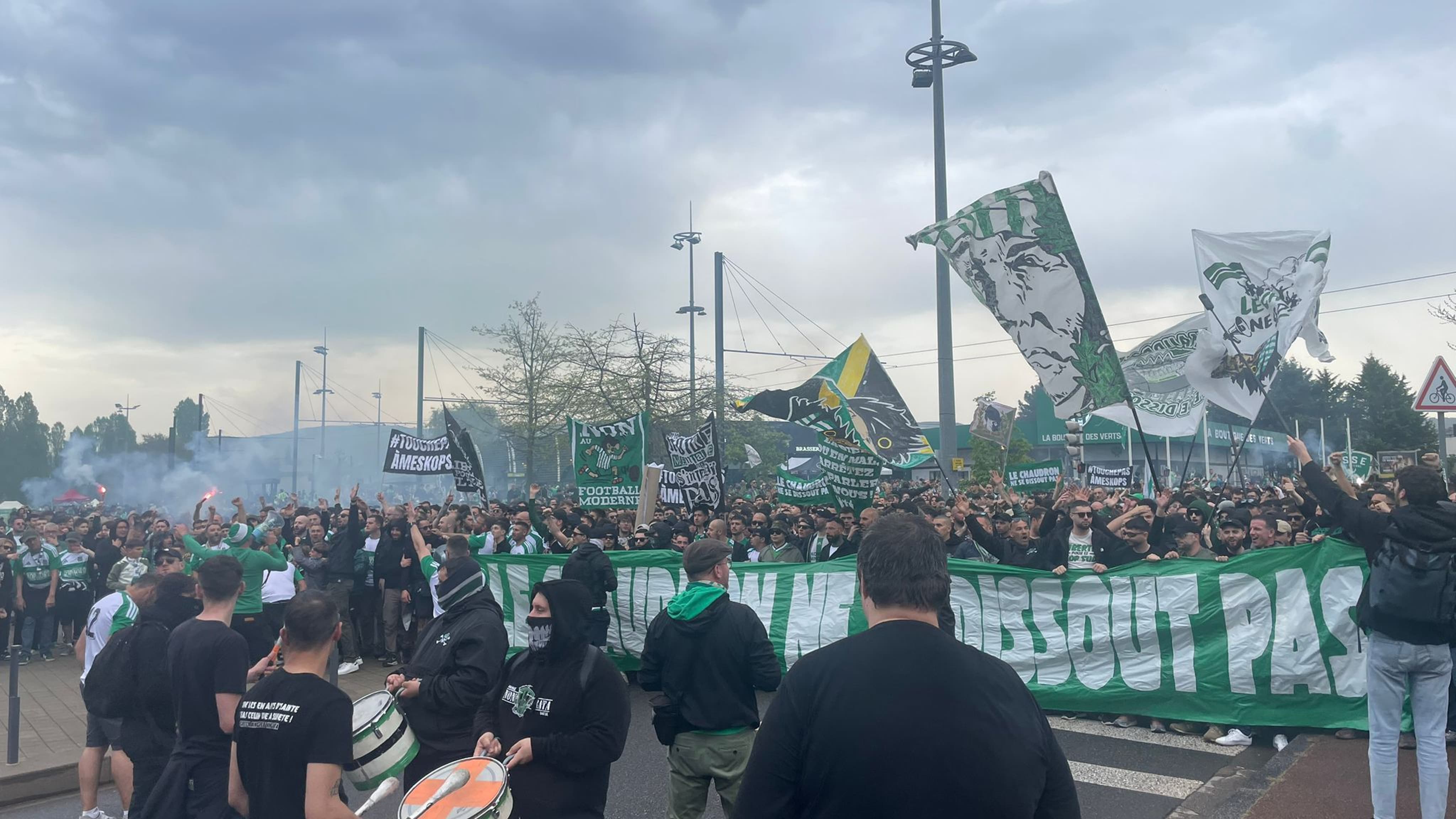 Πριν από αυτή τη συνέντευξη, οι οπαδοί, μεταξύ 3.000 και 5.000 σύμφωνα με τις αρχές, έκαναν πορεία προς το στάδιο Geoffroy Guichard, πίσω από ένα πανό: «Το καζάνι δεν διαλύεται». Τραγούδησαν τραγούδια ενθάρρυνσης, χωρίς καμία εχθρική χορωδία προς κανέναν. Πολλοί φόρεσαν το μοδάτο μπλουζάκι με το ίδιο σύνθημα που εμφανίζεται και στο γήπεδο, σε μια από τις πλευρικές κερκίδες.